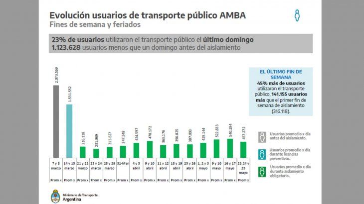 De acuerdo a un relevamiento del Ministerio de Transporte de la Nación, en base a la información recavada mediante el Sistema Único de Boleto Electrónico (SUBE), el sábado 21 y domingo 22 de mayo hubo en total 316.118 pasajeros, unos 141.155 menos que el número del pasado fin de semana que incluyó también el lunes 25 por tratarse de un feriado nacional.