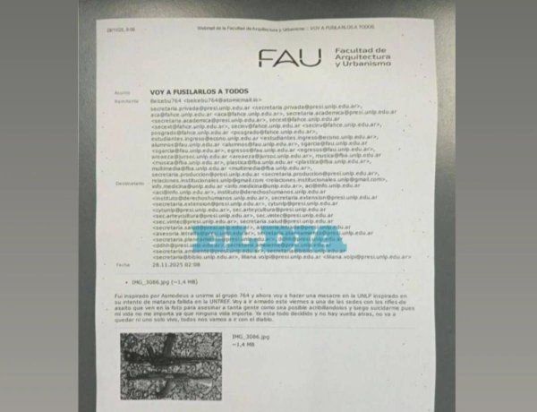 "Fui inspirado por Asmodeus a unirme al grupo 764 y ahora voy a hacer una masacre en la UNLP inspirado en su intento de matanza fallida en la UNTREF", comenzó el mail. Y agregó que iría "armado este viernes a una de las sedes con los rifles de asalto que ven en la foto para asesinar a tanta gente como sea posible".