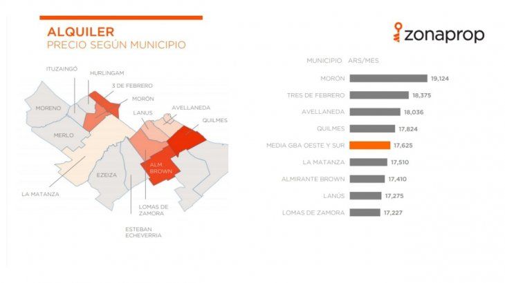 En tanto que Morón ($19.124 por mes), Tres de Febrero ($18.375 por mes), Avellaneda ($18.036 por mes) y Quilmes ($17.824 por mes) representaron los precios más elevados del sector, precisó el análisis inmobiliario.