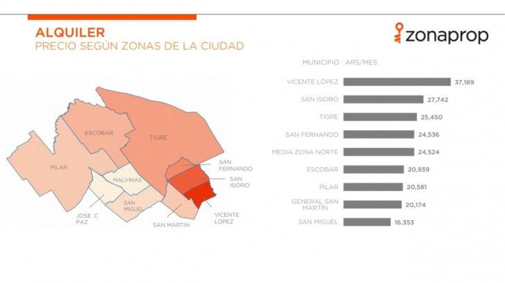 Al desglosar por municipios que conforman la Zona Norte, Vicente López encabeza el listado de los más caros con $37.189, seguido por San Isidro ($27.742 por mes) Tigre ($25.450 por mes) y San Fernando ($24.536 por mes), señaló el estudio.