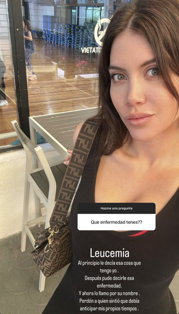 Finalmente, a tres meses de enterarse, decidió confirmar en Instagram su enfermedad, al habilitar la caja de preguntas de sus historias de Instagram. Allí un seguidor le preguntó sin vueltas: “¿Qué enfermedad tenés?”, a lo que ella respondió: “Leucemia”.