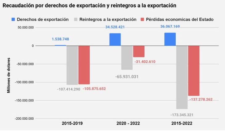 La promoción para todo el sector minero implica para el 2023 un gasto tributario de $58.074 millones, mientras que la estabilidad fiscal por la exención de impuestos diversos estimada es de $1.463 millones. Según un informe realizado por senadores del Frente de Todos, cercanos a la vicepresidente Cristina Kirchner, el Estado realizó reintegros a la exportación por u$s 173,3 millones entre 2015 y 2022. Solo en el período 2020-2022 fueron u$s 65,9 millones. En los años relevados por este trabajo, en el que las fuentes aseguran que se trata de “datos oficiales de Aduana”, el Estado tiene pérdidas debido a que los reintegros superan ampliamente lo recaudado por las retenciones.