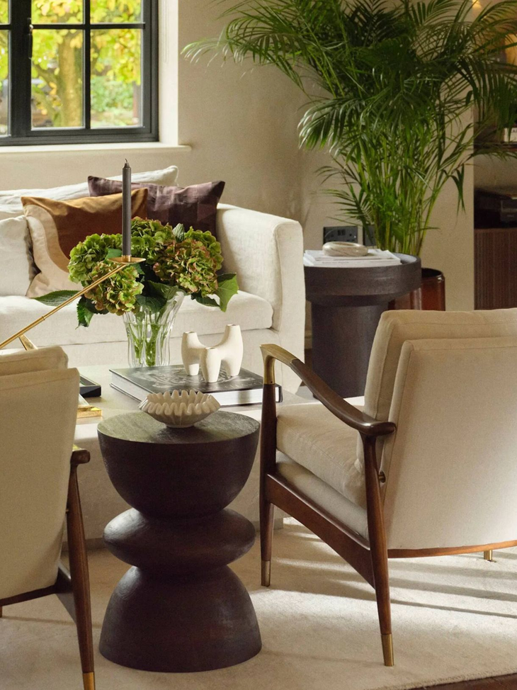 El salón comedor refleja esa búsqueda de una atmósfera acogedora: un gran sofá esquinero tapizado en blanco, una elegante lámpara de arco, que suma un punto moderno sin perder calidez y una estantería oscura de aire retro, que aporta personalidad. Todo el espacio se ve potenciado por la abundante luz natural, que ingresa a través de los amplios ventanales con vista al jardín.