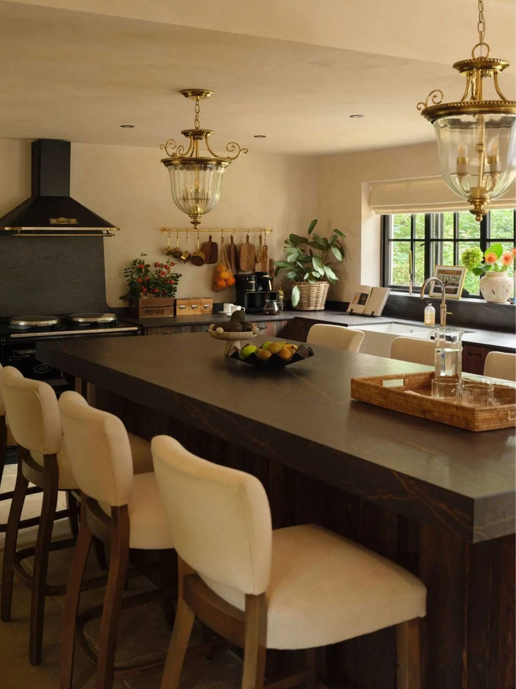 La madera vuelve a ser protagonista en la cocina, donde los muebles en tonos oscuros se combinan con electrodomésticos en negro y una isla central, que funciona como punto focal, superficie de trabajo y mesa informal.