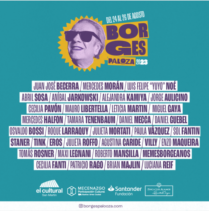 El BorgesPalooza también contará con la presencia de Leticia Martin, Jorge Aulicino, Miguel Gaya, Mercedes Halfon, Daniel Guebel, Osvaldo Bossi, Julieta Mortati, Paula Vázquez, Sol Fantin, Staner, Tink, Eros, Agustina Caride, Villy, Brian Majlin, Patricio Rago, Tomás Rosner, Maxi Legnani, Roberto Mansilla, Memes borgeanos, Cecilia Fanti, Enzo Maqueira y Luciana Reif.