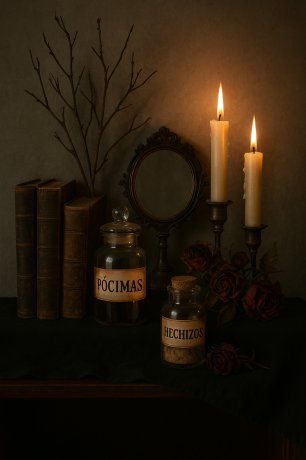 Elegí un estante, una mesita o una esquina poco usada y convertila en tu rincón místico. Juntá libros viejos, frascos con etiquetas de “pócimas”, espejos antiguos, ramas secas, flores marchitas o velas desgastadas. La idea es jugar con lo que tengas a mano y crear un pequeño altar misterioso que evoque historias y hechizos.