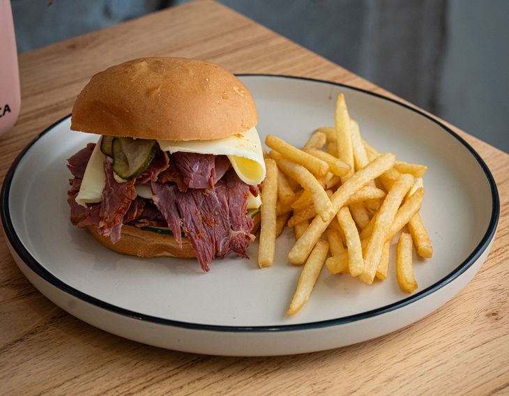 El sándwich de pastrami es uno de los ejes de la carta de Sole di Parma y sintetiza el enfoque artesanal del proyecto. Se prepara con focaccia elaborada en el propio local, a partir de masa madre y una fermentación controlada de 24 horas, que define su textura y estructura. El relleno se compone de pastrami casero, producido con tapa de asado que atraviesa un prolongado proceso de curado en salmuera especiada y una cocción lenta posterior. La combinación se completa con relish de pepinos, queso crema y mostaza, integrados de forma precisa. Se puede acompañar con una limonada de hibiscus o una kombucha. Esta preparación convive con una propuesta más amplia que se desarrolla en la pasticceria y focacceria familiar, donde se elaboran a diario panes, focaccias al corte, productos de pastelería italiana y una variedad de sándwiches. La carta suma antipasti, opciones de cafetería y desayunos disponibles durante toda la jornada, con servicio en salón y mesas al aire libre.