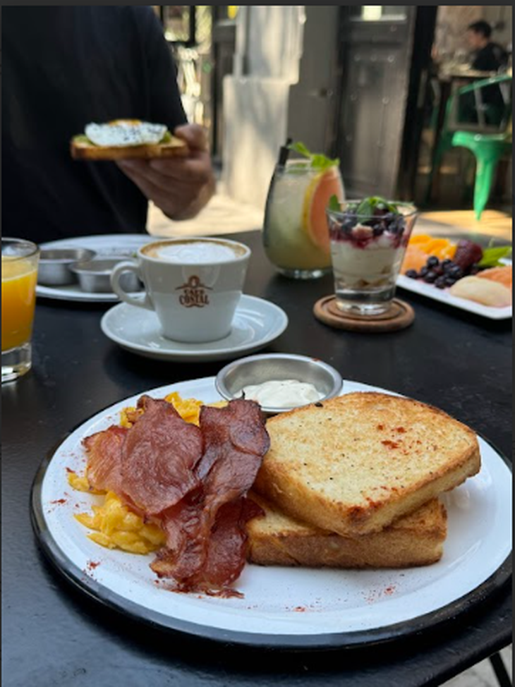 En Bilbao, el bacon aparece como un guiño sabroso que atraviesa la carta y suma carácter a distintas propuestas del día. Su presencia más evidente está en el Desayuno Americano, una de las alternativas más elegidas de la casa: tostadas de pan de molde casero con manteca artesanal, bacon crocante y huevos a elección —revueltos o estrellados—, acompañados por jugo de naranja natural, café o té y un plato de frutas. Acá, la panceta ahumada equilibra todas las opciones, gracias a su perfil intenso y salino. Así, el bacon se integra a la experiencia Bilbao como un detalle goloso que realza sin quitar frescura.