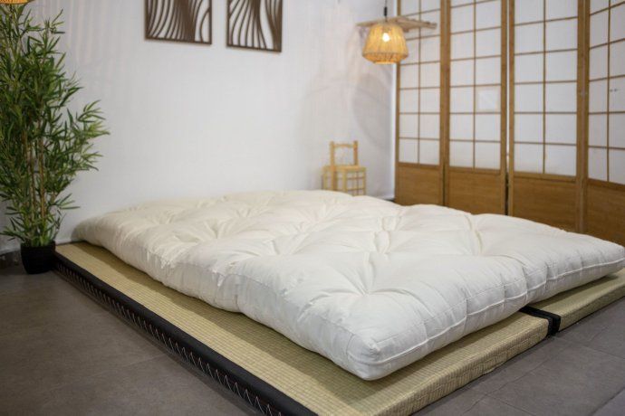 El futón -un colchón delgado que se coloca sobre un piso de paja prensada que cumple la función de aislante térmico natural- constituye la base del descanso en muchas casas japonesas. El sistema suma en invierno un shikibuton más grueso como soporte inferior y un kakebuton como cobertura superior (cobertores del colchón que cumplen la misma función y completan la acción de protección)