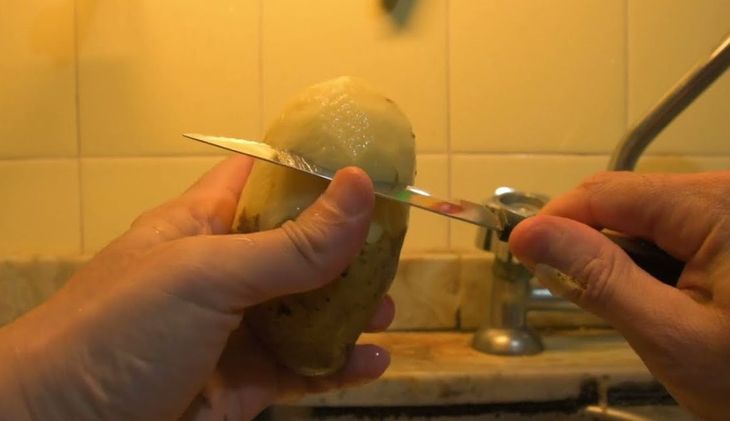 - Con un cuchillo, le hacemos un corte en forma de "V" del lado que pelamos la papa.