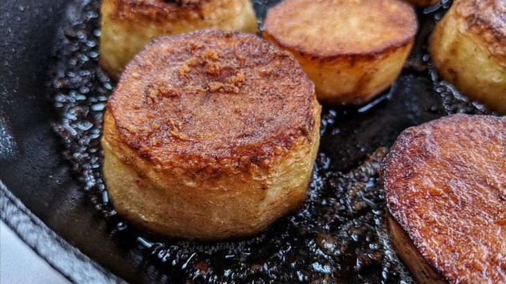 Las papas se cocinan primero en agua o caldo para ablandarlas y luego se doran en manteca derretida o aceite caliente en una sartén.
