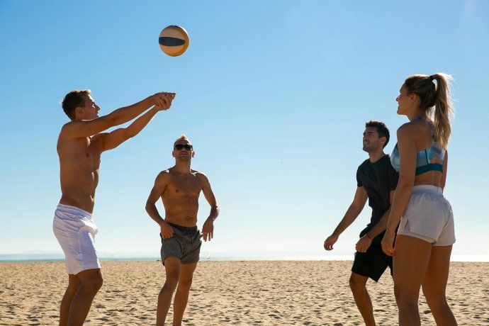 Vóley playero improvisado: con o sin red formal, los partidos se arman rápido y convocan a desconocidos que se suman al juego.