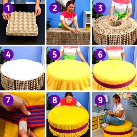Y listo, ya tenés el puff más cómodo, resistente y completamente hecho con materiales reciclados. Es una forma creativa y económica de darles una segunda vida a los maples de cartón, sumando un asiento extra o un apoyo decorativo al hogar.