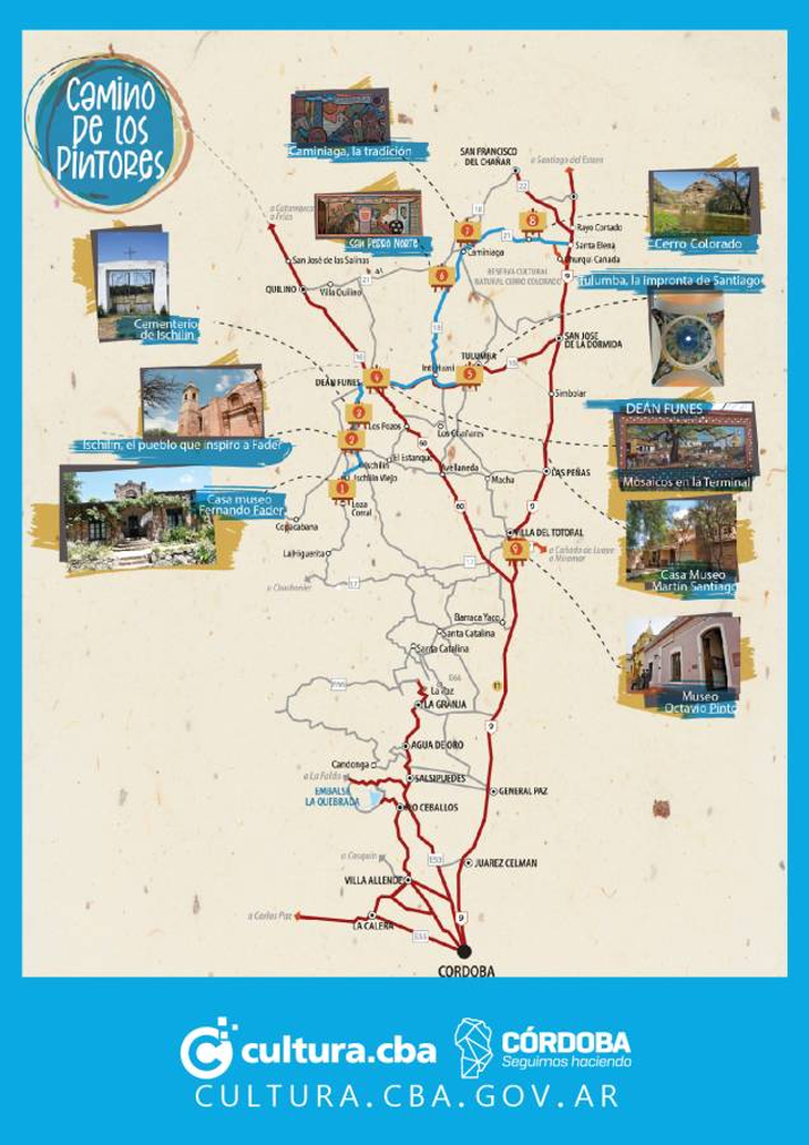 El Camino de los Pintores es un recorrido de 100 kilómetros, a través de las obras de los pintores impresionistas más importantes del norte cordobés. Incluye ocho puntos de interés cultural en los departamentos de Ischilín, Tulumba y Río Seco. Museos, sitios históricos y al aire libre son parte de la propuesta.