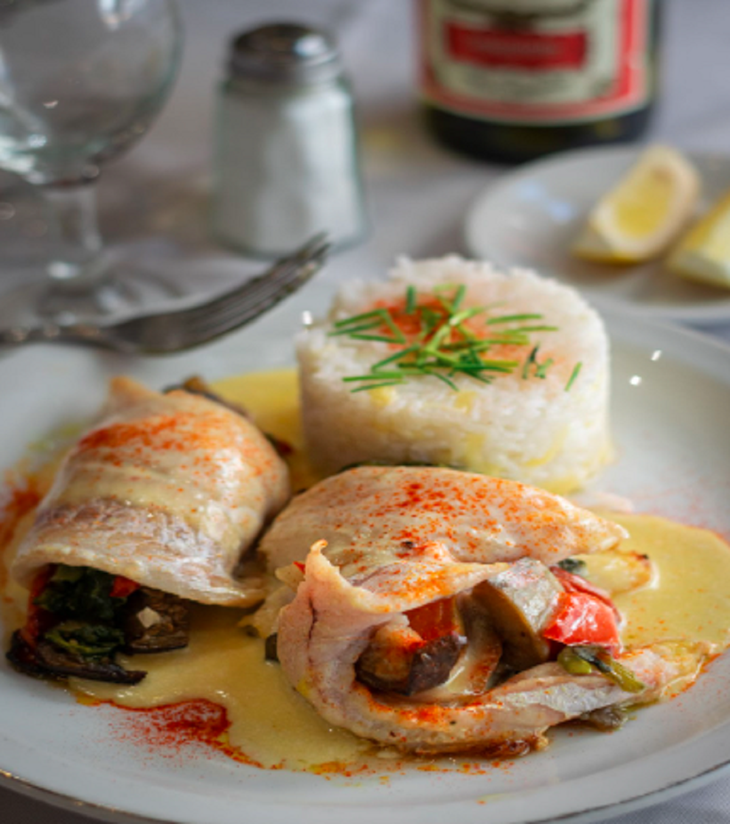 Rolls de lenguado con verduras salteadas y timbal de arroz (para dos personas)