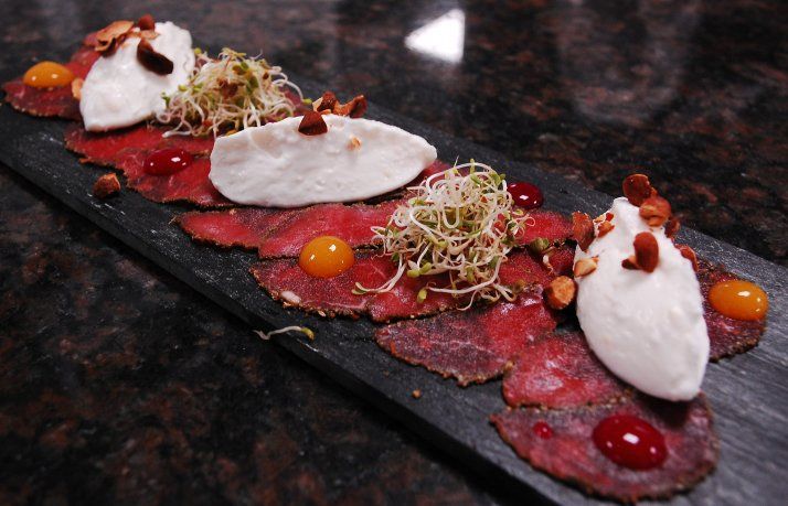 Carpaccio de Cordero con Salmorejo de Almendras