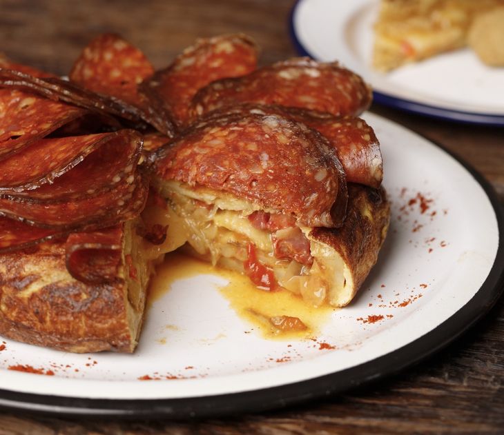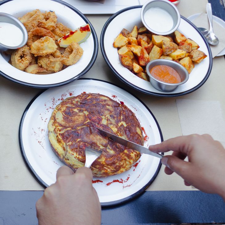 El tapeo es el alma del lugar, con tortillas en distintas versiones, las infaltables papas bravas, los chipirones al vino blanco y el inconfundible jamón ibérico que se sirve en finas láminas.