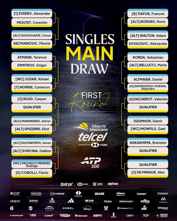 El alemán Alexander Zverev, actual número tres del mundo, encabezará el cuadro y debutará frente al francés Corentin Moutet, con la posibilidad de enfrentar en la siguiente ronda al ganador del duelo entre Miomir Kecmanovic y Tristan Schoolkate. Zverev, finalista en Acapulco en 2019 y 2021, parte como uno de los grandes candidatos al título en una edición que reúne a varios de los mejores jugadores del mundo.