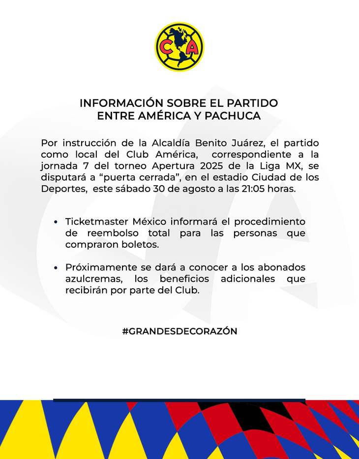 El América informó que habrá reembolso para todos los aficionados que ya habían adquirido entradas, algo que igualmente no ha generado alegría en los hinchas que querían acompañar a su equipo.