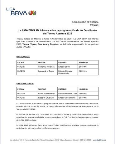 La Liga MX anunció que los partidos de semifinal del Apertura 2025 se disputarán el mismo día, una medida que responde a la necesidad de ajustar el calendario por la participación de Cruz Azul en la Copa Intercontinental.