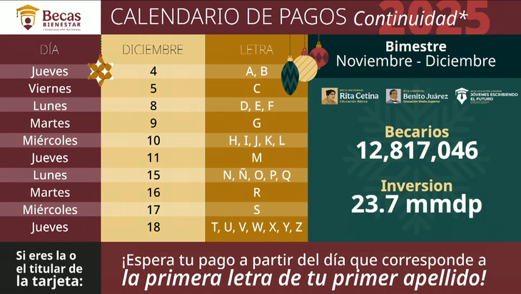 Beca Benito Juárez de diciembre 2025: calendario de pagos por letra