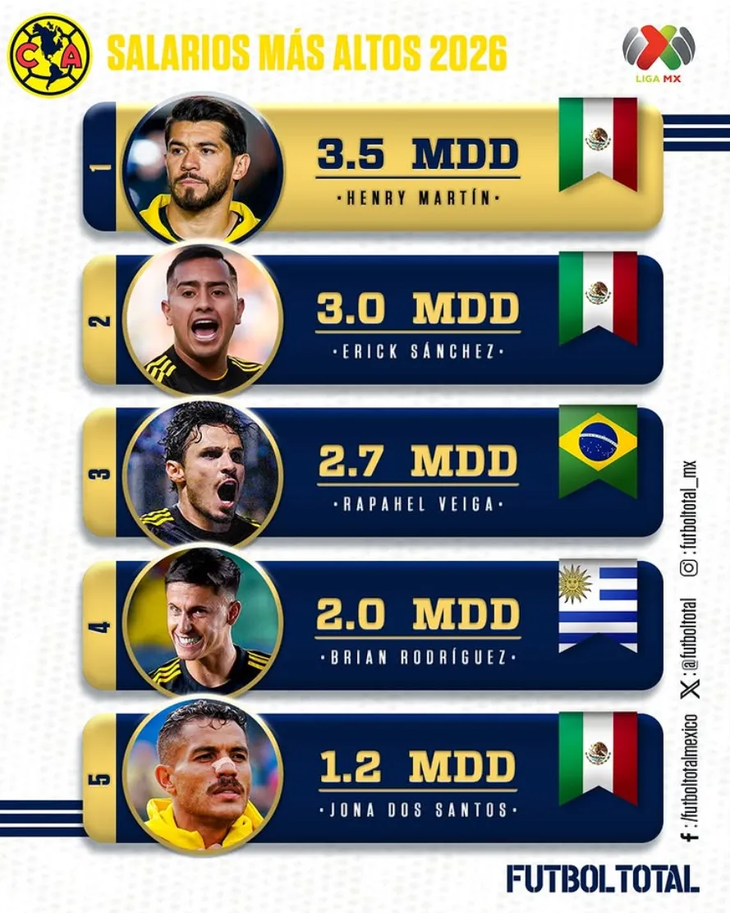 El Top 5 de salarios más altos en el América en el 2026