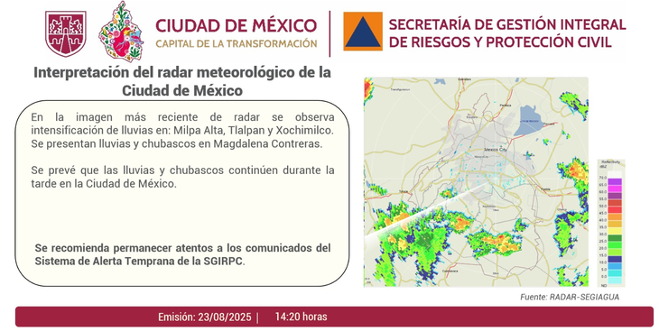 Este sábado 23 de agosto de 2025, la Secretaría de Gestión Integral de Riesgos y Protección Civil informó que hay Alerta Amarilla con intensas lluvias y caída de granizo en seis alcaldías de CDMX.