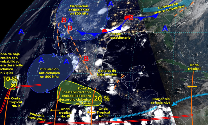 El Servicio Meteorológico Nacional (SMN) alertó sobre el desplazamiento de la onda tropical número 11 este jueves 18 de julio del 2024, el cual generará tormentas en varios estados del país. El fenómeno se desplazará sobre el centro y sur del país, que se combinará con inestabilidad en niveles altos de la tmósfera e ingreso de humedad del océano Pacífico.