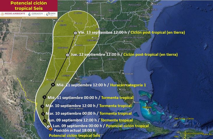 El potencial ciclón tropical 6, que sería huracán categoría 1 el próximo miércoles, se encontraba en la tarde del domingo a 275 kilómetros al este-noreste de Cabo Rojo, Veracruz, y a 510 kilómetros al sur-sureste de la desembocadura de Río Grande, la frontera con Estados Unidos.