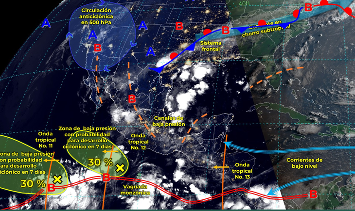 Asimismo, la onda tropical No. 13 que se desplazará sobre el sur de la península de Yucatán, originará lluvias aisladas en zonas de Quintana Roo, Yucatán y Campeche. Un canal de baja presión sobre el sur del golfo de México y el flujo de aire húmedo proveniente del mar Caribe, producirán lluvias puntuales intensas en Oaxaca y Veracruz; y puntuales muy fuertes en Chiapas y Tabasco, todas con descargas eléctricas.
