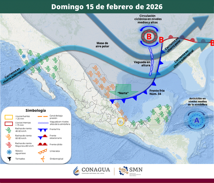 El sábado 14 de febrero 2025, por ejemplo, el pronóstico de lluvias solo prevé solo lluvias aisladas (0.1 a 5 mm) en Chihuahua, Coahuila, Puebla, Veracruz y Oaxaca. El domingo, y por injerencia del Frente Frío 34, se pronostican chubascos con lluvias puntuales fuertes (25 a 50 mm) en Puebla (Tehuacán-Sierra Negra), Veracruz (Montañas y Papaloapan) y Oaxaca.