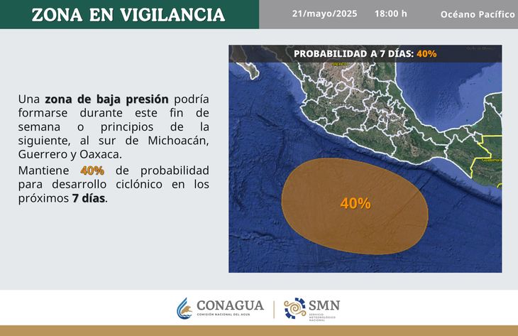 Hoy, miércoles 21 de mayo, la Comisión Nacional del Agua (Conagua) confirmó la activación de Zona de Vigilancia en el océano Pacífico por la formación de una zona de baja presión que podría generar el primer ciclón tropical, conocido como Alvin, la siguiente semana.