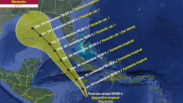 Según el SMN, la Depresión Tropical Dieciocho se convertirá en huracán categoría 1, el próximo miércoles 6 de noviembre a las 00:00 horas a 535 kilómetros al este de Cancún, Quintana Roo. Con el paso de los días, más precisamente el viernes 9 de noviembre este ciclón se encontrará más alejado de tierras mexicanas, a 695 kilómetros y degradado a tormental tropical.