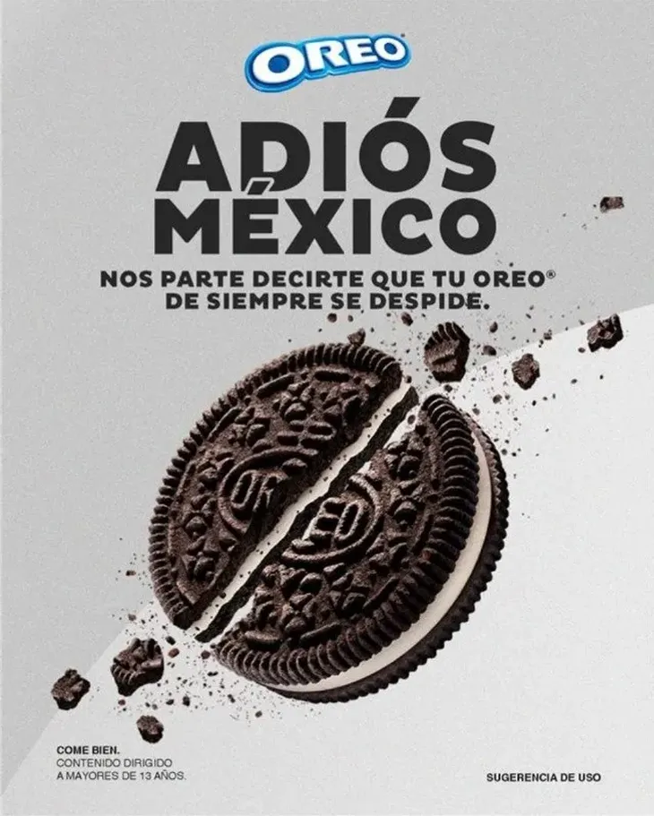 La popular marca de galletas Oreo publicó un aviso en sus redes sociales con la frase “Adiós, México, nos parte decirte que tu Oreo de siempre se despide”, junto a ello una imagen de la galleta partida a la mitad. La fuerte publicación despertó sorpresa en sus usuarios que no dejaron de formar hipótesis sobre este enigmatico mensaje.