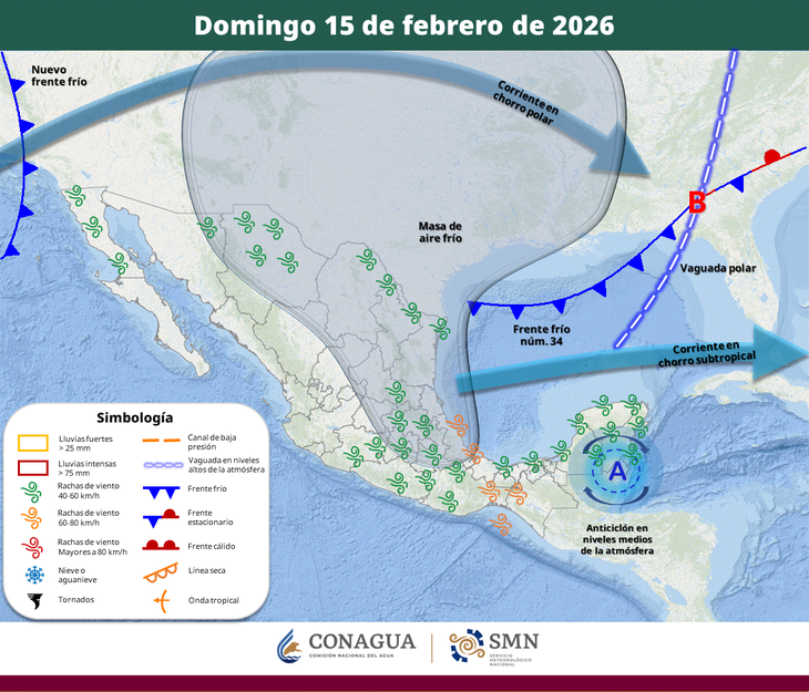 Frente frío 34 se aleja, pero deja lluvias, vientos y calor extremo en México, domingo 15 de febrero 2026