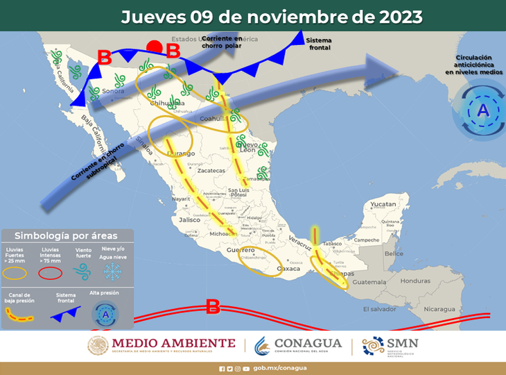 Con el ingreso de humedad generada por la corriente en chorro subtropical, se producirán fuertes rachas de viento de hasta 80 kilómetros por hora con posible formación de tolvaneras en el norte de Chihuahua, Coahuila, Nuevo León y Tamaulipas.