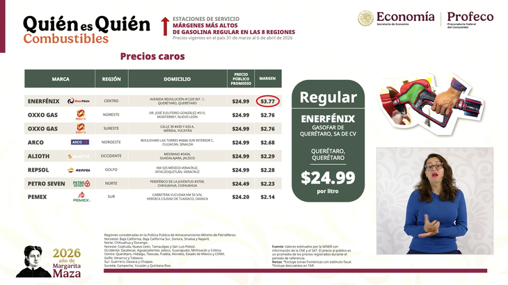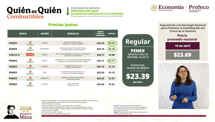 "Si no estuvieramos interviniendo para apoyar el precio de la gasolina y el diésil, la gasolina estaría en más de $30 el litro y el diésel $32. Ayer, volvió a subir el barril de petroleo por la situación en Irán y está sobre $102/$103 dólares. Entonces, lo que hicimos fue apoyar el precio de la gasolina magna y no puede pasar de $24, que es como venía desde el año pasado", aclaró Claudia Sheinbaum.