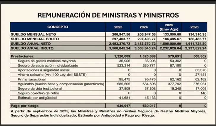 La presidenta Sheinbaum mostró una tabla comparativa con la remuneración de ministras y ministros, de acuerdo a los ingresos que han recibido en 2023, 2024, 2025 y 2026. Subrayó que a partir de septiembre del 2025, con la integración de la nueva Corte, no recibe Gastos Médicos Mayores, Seguros de Separación Individualizada, Estímulo por Antigüedad y Pago por Riesgo.