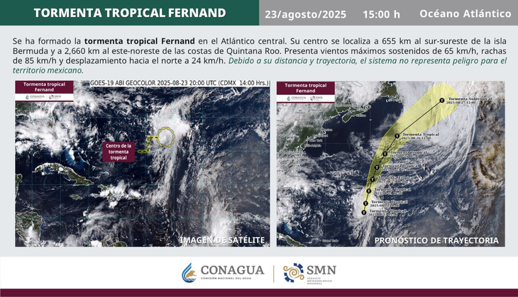 La Comisión Nacional del Agua ha confirmado la formación de la Tormenta Tropical Fernand en el Atlántico central, ubicada a 655 km al sur-sureste de la isla Bermuda y a 2,660 km al este-noreste de las costas de Quintana Roo.