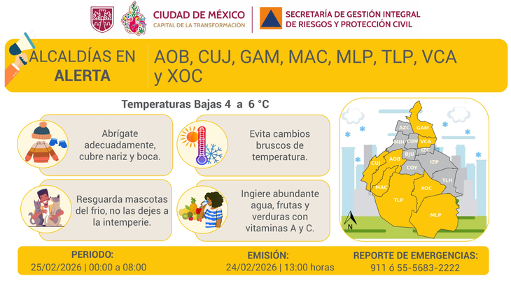 La Ciudad de México (CDMX) está más fría que nunca hoy, ya que la Secretaría de Gestión Integral de Riesgos y Protección Civil (SGIRPC) ha emitido un informe meteorológico con la activación de la alerta amarilla en 8 alcaldías para este miércoles 25 de febrero 2026.