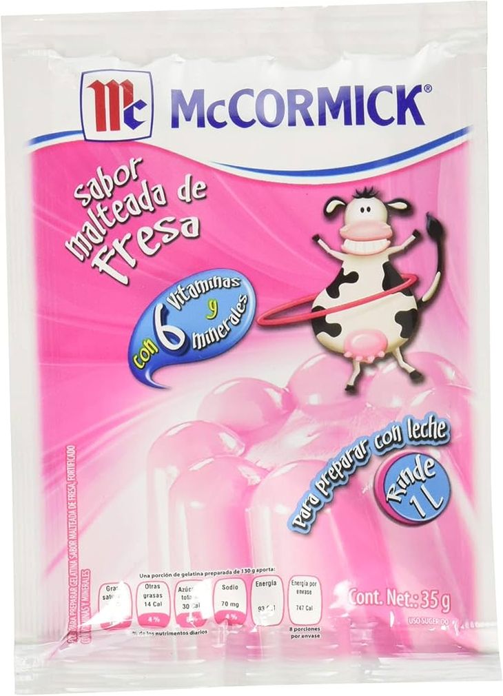 De acuerdo con los resultados del análisis, la única marca que incorpora vitaminas y minerales en su formulación es McCormick, específicamente en sus presentaciones de polvo para preparar gelatina sabor malteada de fresa y sabor fresa, ambas fortificadas.