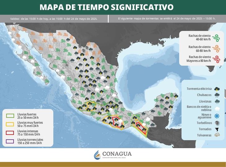La Comisión Nacional del Agua (Conagua) dio a conocer el mapa completo de estados con afectaciones por lluvias intensas durante el fin de semana, hasta el lunes 26 de mayo. En este contexto, el Servicio Meteorológico Nacional (SMN) detalló que Oaxaca, Chiapas, Michoacán y Guerrero son las entidades más afectadas.