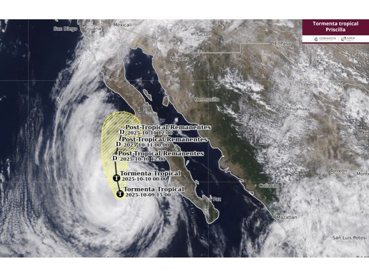 La tormenta tropical Priscilla se desplaza paralela a la costa occidental de Baja California Sur. Sus bandas nubosas mantendrán chubascos con lluvias puntuales fuertes, así como fuertes rachas de viento y oleaje elevado en Baja California Sur.