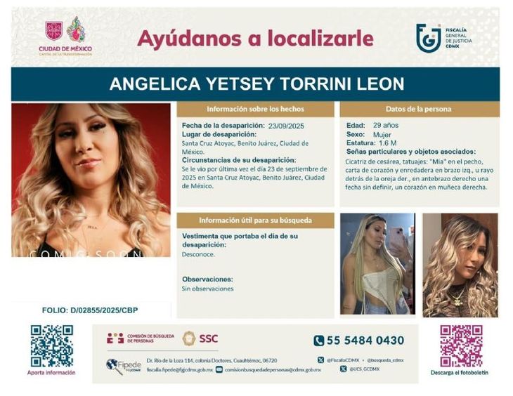Angie Miller, cuyo nombre real es Angélica Yestey Torrini León, fue reportada como desaparecida por sus seres queridos, quienes comenzaron a sospechar de su ausencia tras enterarse que había dejado sola a su hija de apenas 2 años la noche del 25 de septiembre. El periodista Alex Rodríguez detalló que la venezolana salió de su domicilio alrededor de las 19:00 horas y desde entonces no se ha vuelto a saber de ella.