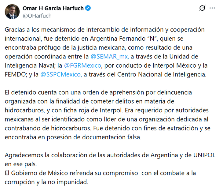 A través de sus redes sociales, García Harfuch reconoció el apoyo del gobierno sudamericano para lograr esta aprehensión con fines de extradición: