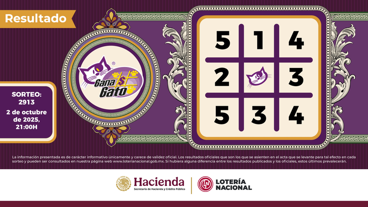 La Lotería Nacional realizó este jueves 2 de octubre del 2025 el sorteo 2913 de Gana Gato, uno de los juegos más divertidos y que generan semana a semana una gran expectativa. Entérate cuáles fueron los resultados y checa si sos uno de los afortunados ganadores.