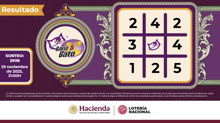 La Lotería Nacional realizó este sábado 29 de noviembre del 2025 el sorteo 2938 de Gana Gato, uno de los juegos más divertidos y que generan semana a semana una gran expectativa. Entérate cuáles fueron los resultados y checa si sos uno de los afortunados ganadores.