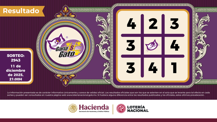 La Lotería Nacional realizó este jueves 11 de diciembre del 2025 el sorteo 2943 de Gana Gato, uno de los juegos más divertidos y que generan semana a semana una gran expectativa. Entérate cuáles fueron los resultados y checa si sos uno de los afortunados ganadores.