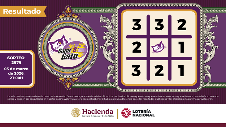 La Lotería Nacional realizó este jueves 5 de marzo del 2026 el sorteo 2979 de Gana Gato, uno de los juegos más divertidos y que generan semana a semana una gran expectativa. Entérate cuáles fueron los resultados y checa si sos uno de los afortunados ganadores.