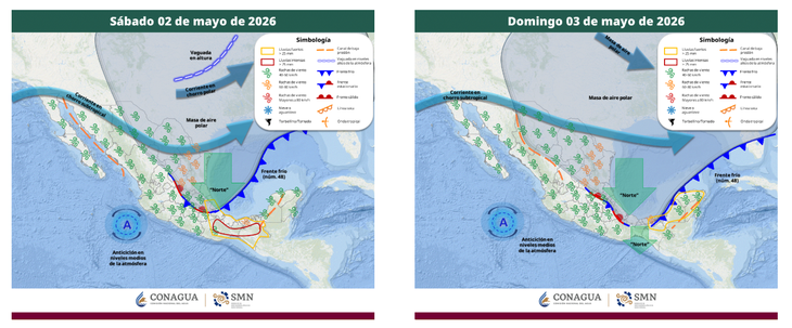 El viernes, el Frente Frío número 48 ecorrerá el norte y noreste de México, interaccionará con la corriente en chorro subtropical y un canal de baja presión que se extenderá a lo largo de la Sierra Madre Oriental, originando lluvias y chubascos con descargas eléctricas en las citadas regiones, con lluvias puntuales fuertes y posible caída de granizo en Nuevo León (centro), Tamaulipas (norte), Puebla (noreste) y Veracruz (centro). La masa de aire polar que impulsará al frente frío (núm. 48) propiciará vientos fuertes y descenso de la temperatura en el norte y noreste del país, y durante las primeras horas del sábado, originará evento de “Norte” intenso, con rachas de viento de 80 a 100 km/h y oleaje elevado en las costas de Tamaulipas y norte de Veracruz.